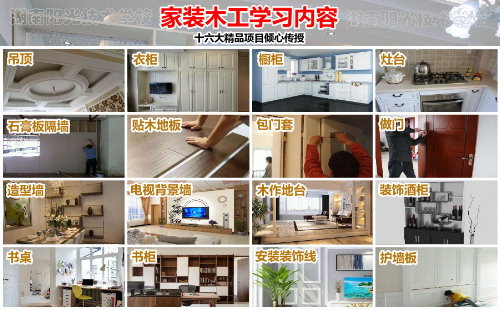 吊顶、衣柜、橱柜、灶台、石膏板隔墙、贴木地板、**门头、**门套(**括做门)、造型墙、电视装饰背景制作、木作地台、装饰酒柜、书桌、书柜、安装木质装饰线、护墙板、木工识图、整体集成墙面装修等十六种家装木工技术。